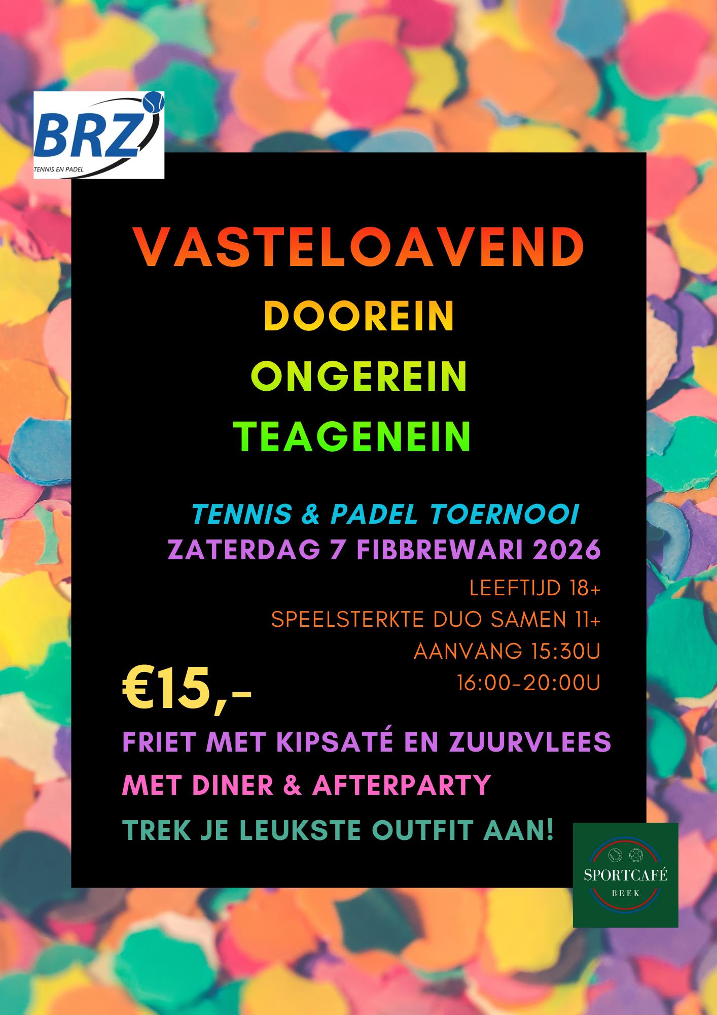 Op zaterdag 7 februari organiseren we voor onze 18+ leden de 5e editie van het Doorein β Ongerein β Teage Ein tennis- en padeltoernooi! Verwacht fanatieke wedstrijden, veel gezelligheid en natuurlijk de leukste carnavalsoutfits π₯³πͺ.